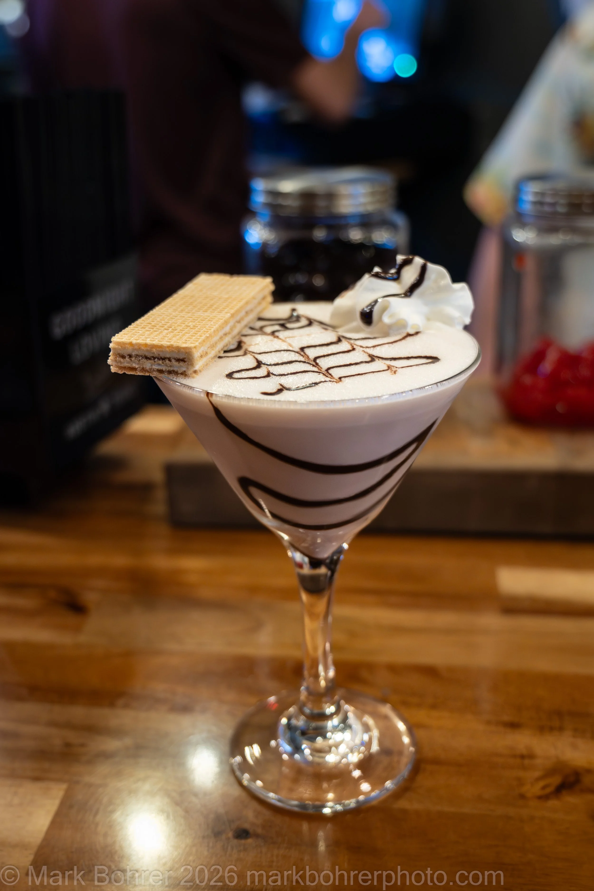We retired for drinks at Rockport's not-obviously-located Whiskey Palm Bar. Bartender Mark mixed us two rounds, a Buffalo Trace Manhattan for my wife and a birthday cake martini for me: chocolate syrup, chocolate liqueur, vanilla vodka. The menu says it's made with Mozart chocolate liquor, amaretto, vanilla vodka and cream. Mark painted the glass with chocolate syrup, then streaked the surface with lines of syrup. He crosshatched those lines with a toothpick for a pretty chocolate lattice. The result was delicious.