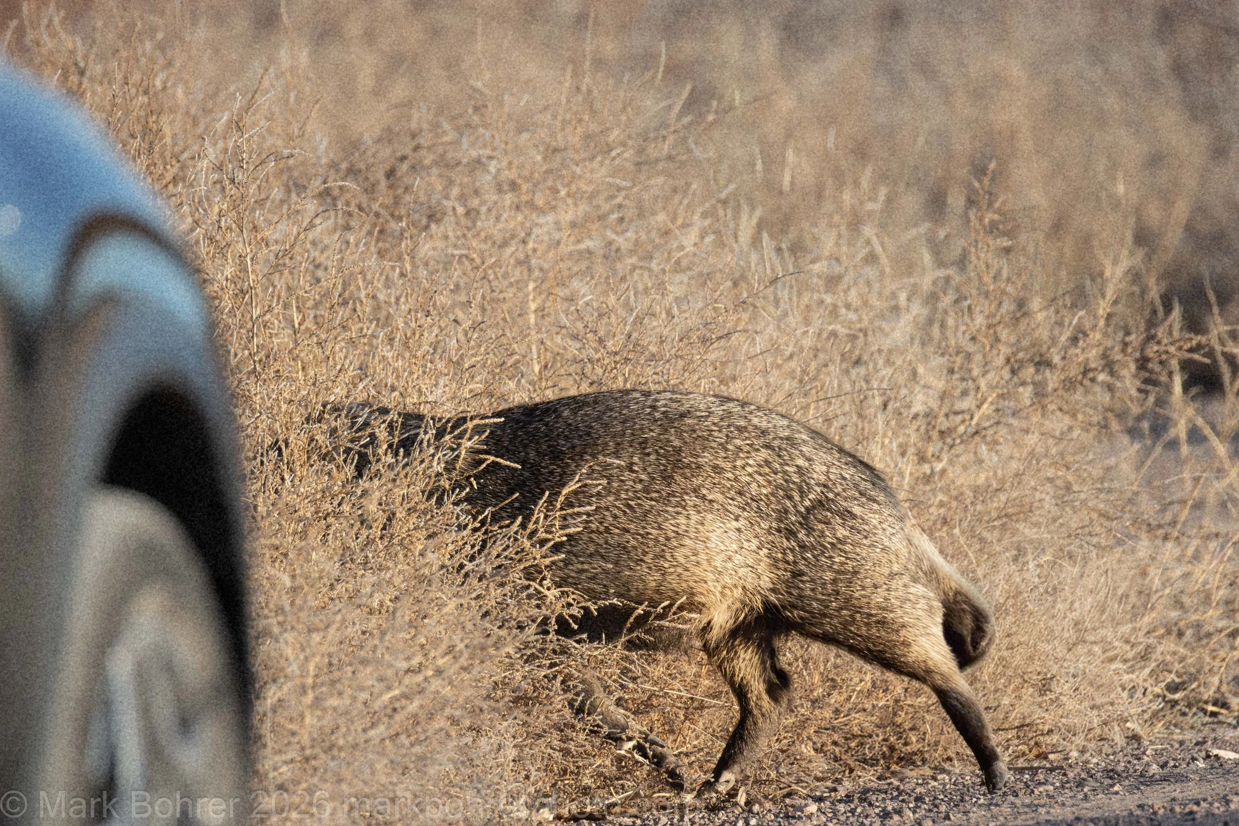 Our initial stop was at Bosque Del Apache. I knew where to look for javalinas from seeing and missing them before, and was rewarded with a small group of them on the return road of the North Loop. Right after I got there and set up, though, several clueless visitors drove through and spooked them all away. Instead of a group shot, I had to be satisfied with one decent individual shot of the last one standing as the rest loped away.