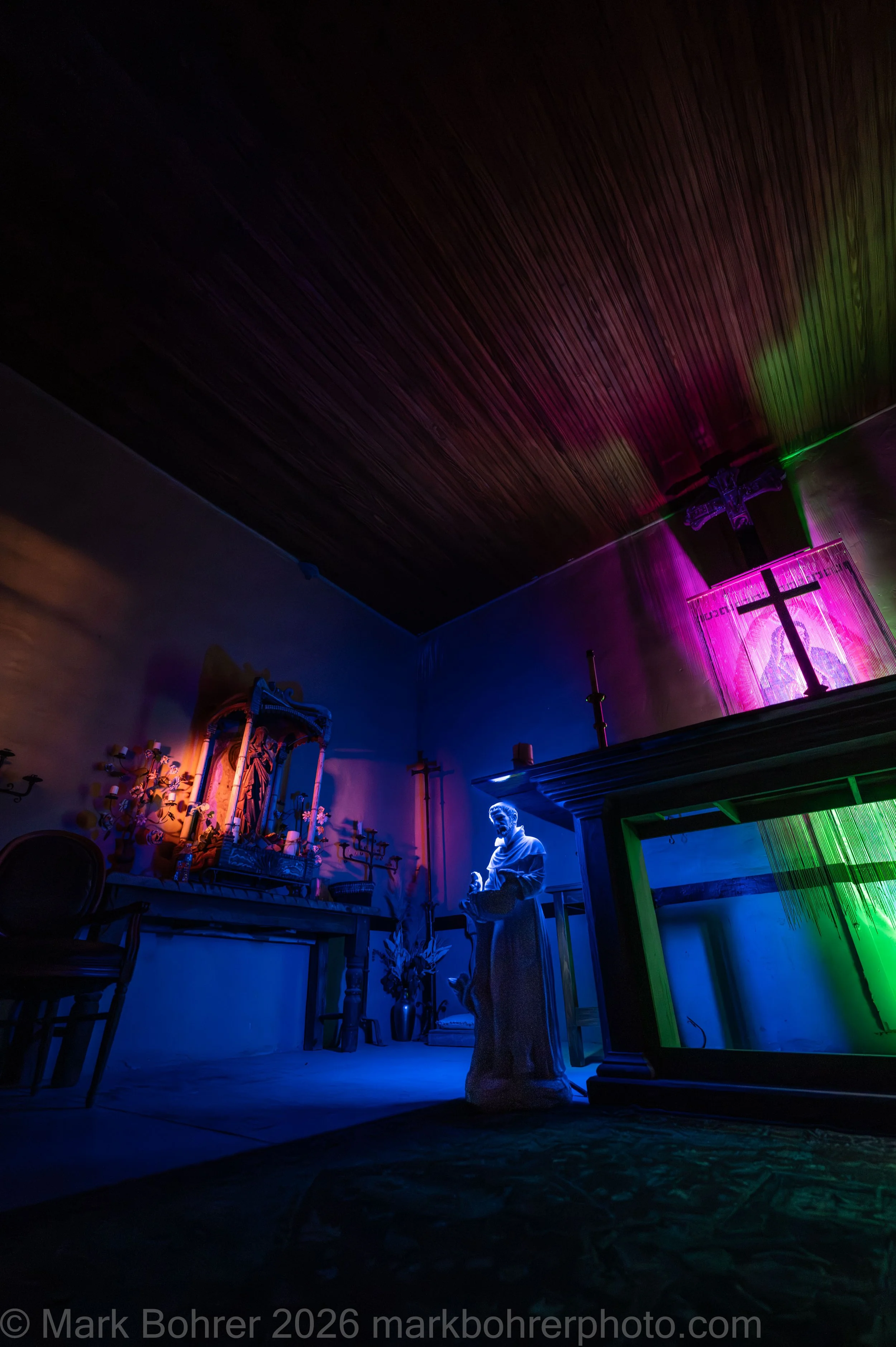 I previsualized better and captured more satisfying shots in Terlingua. I lit the interior of St Agnes Church - the offertory statue of a monk, front altar screen, communion desk. Also put a light in one of the pews for a mystery worshiper. But I didn't do the exterior - it was cloudy, with limited stars. And I was running out of time.